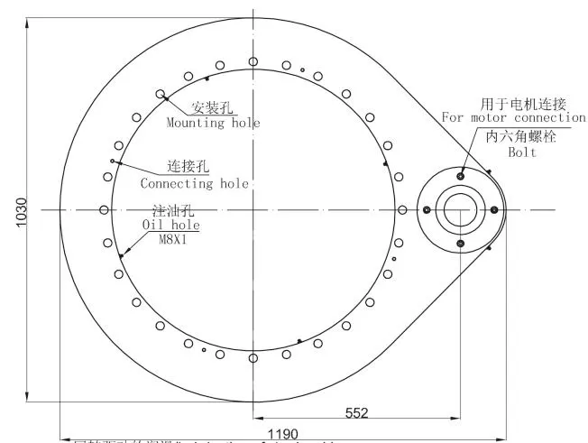 Lubrication of slewing drive; 3 M8X1 grease nipples on the inner ring; 2 M8X1 grease nipples on the housing; Slewing drive supplied pre-lubricated.