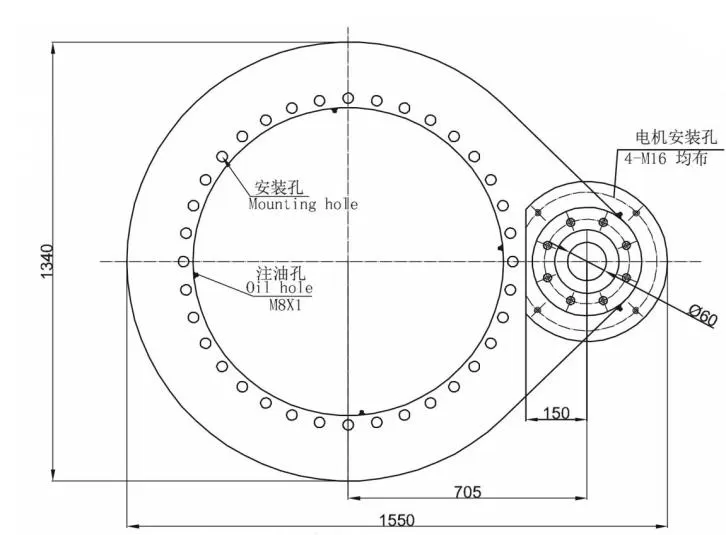 Lubrication of slewing drive; 3 M8X1 grease nipples on the inner ring; 2 M8X1 grease nipples on the housing; Slewing drive supplied pre-lubricated.