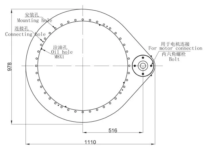 Lubrication of slewing drive; 4 M8X1 grease nipples on the inner ring; 2 M8X1 grease nipples on the housing; Slewing drive supplied pre-lubricated.
